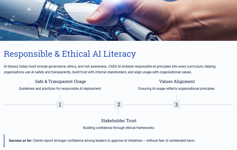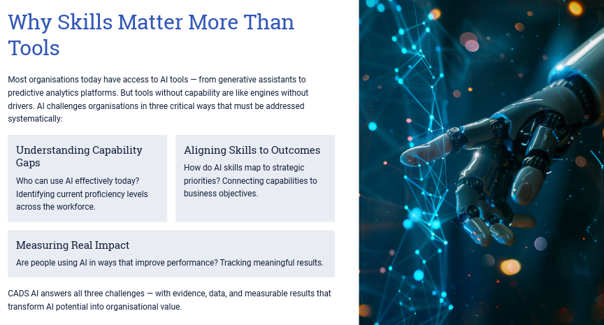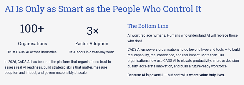 Artificial Intelligence has shifted from a futuristic idea to a practical workplace companion. Today, AI can generate insights, automate routine work, accelerate decision-making, and unlock creativity across every function of an organisation. But here's a reality every business leader must face: AI won't deliver results by itself. Human capability determines AI's success. AI is powerful — yes. But only people who know how to control it, apply it, and measure its impact can turn that power into real value.
