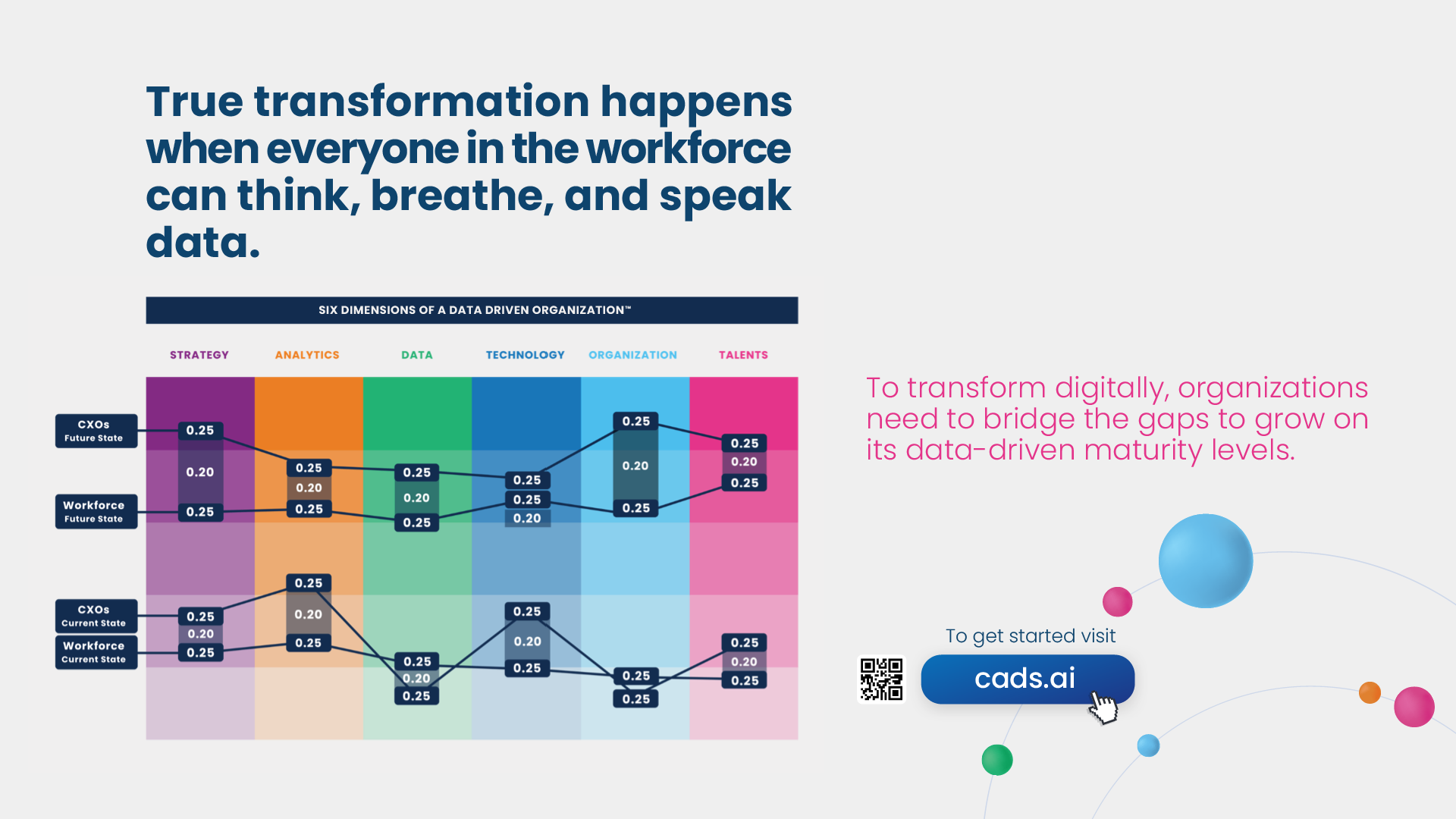 Transitioning from a traditional business to a data-driven organization is like getting an elephant to fly. CADS AI Skills Intelligence Platform™ can assist organizations in accelerating transformation based on the areas outlined below: