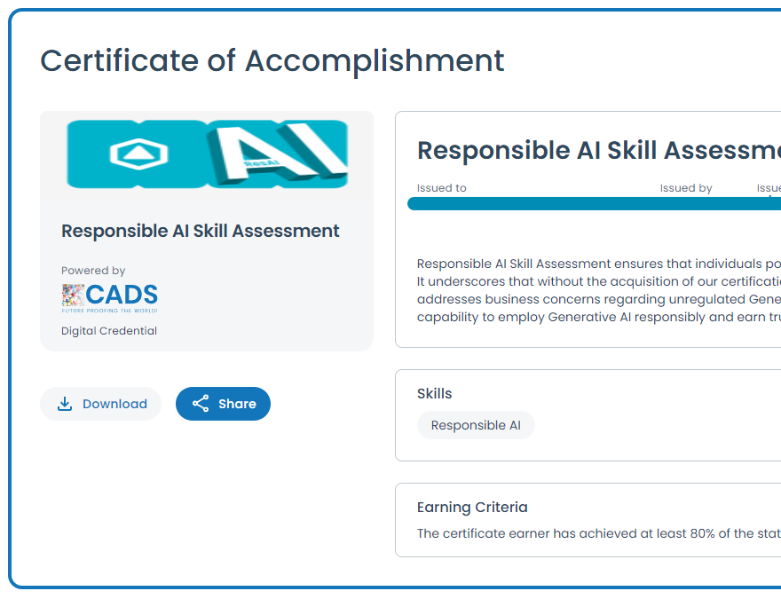 CADS.AI has launched a new skill assessment on the platform called the Responsible AI Skill Certificate to assist you in achieving AI success. This straightforward questions ensures that anyone can possess the necessary knowledge and awareness of AI tools and maintain high standards when utilizing them.
