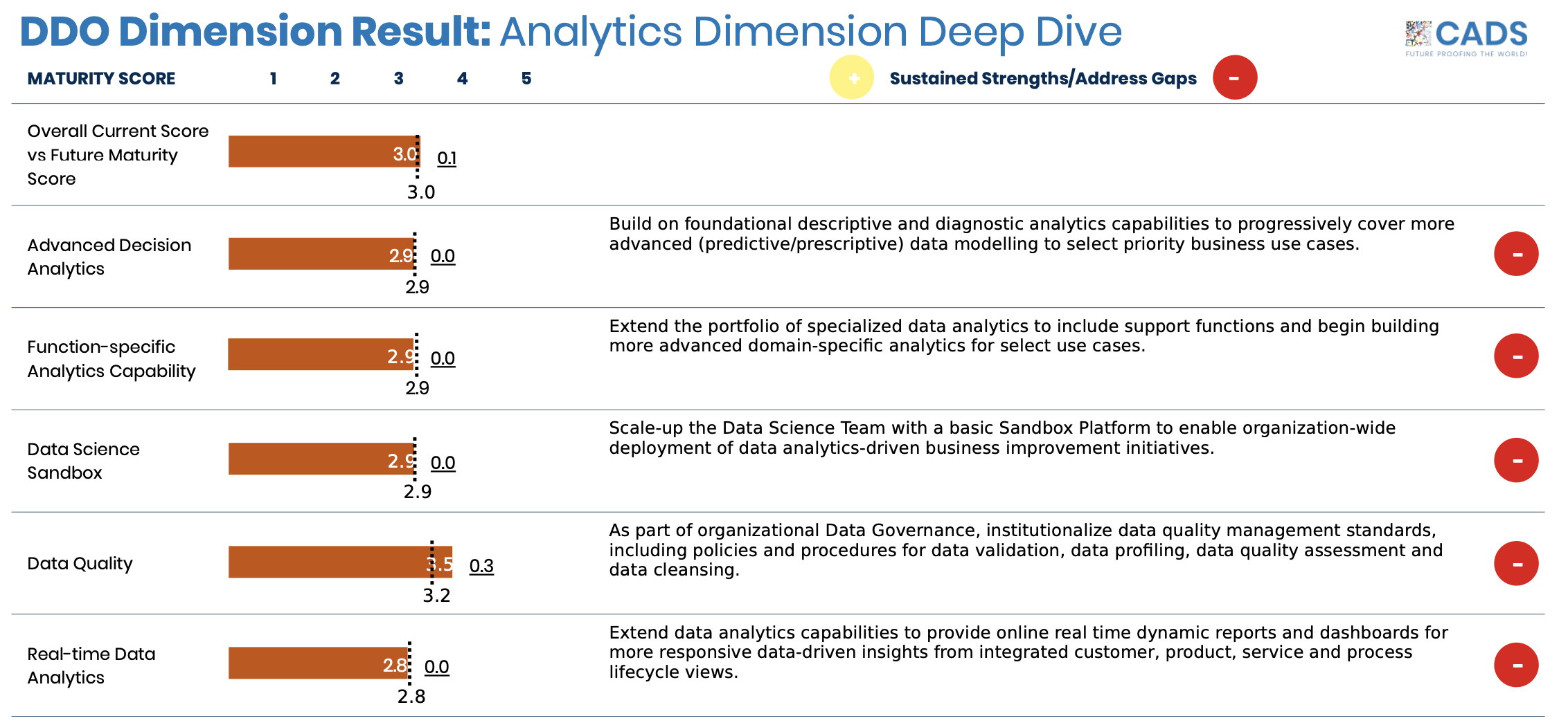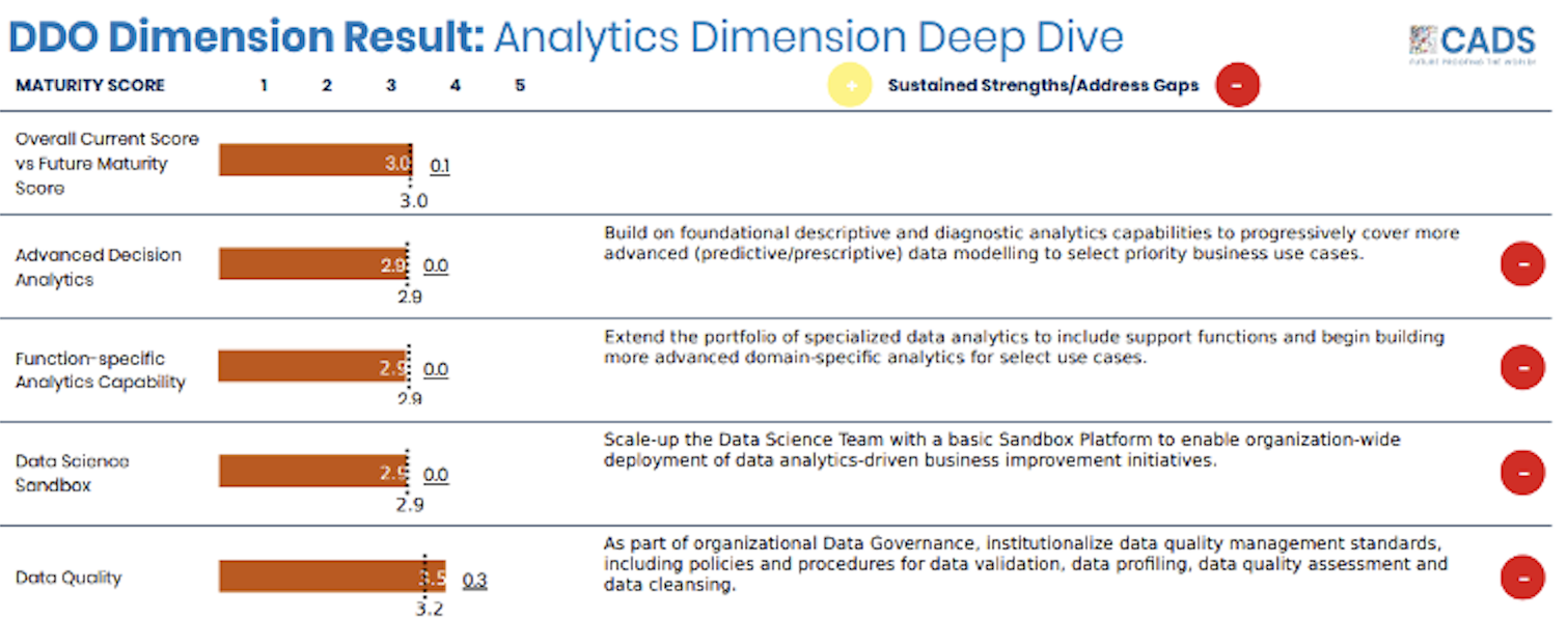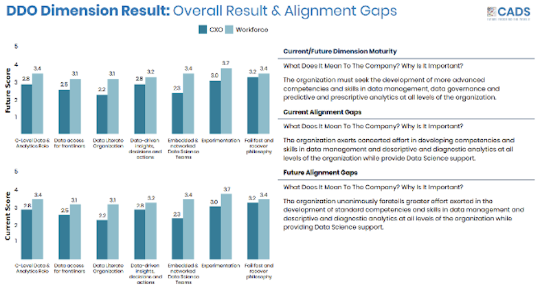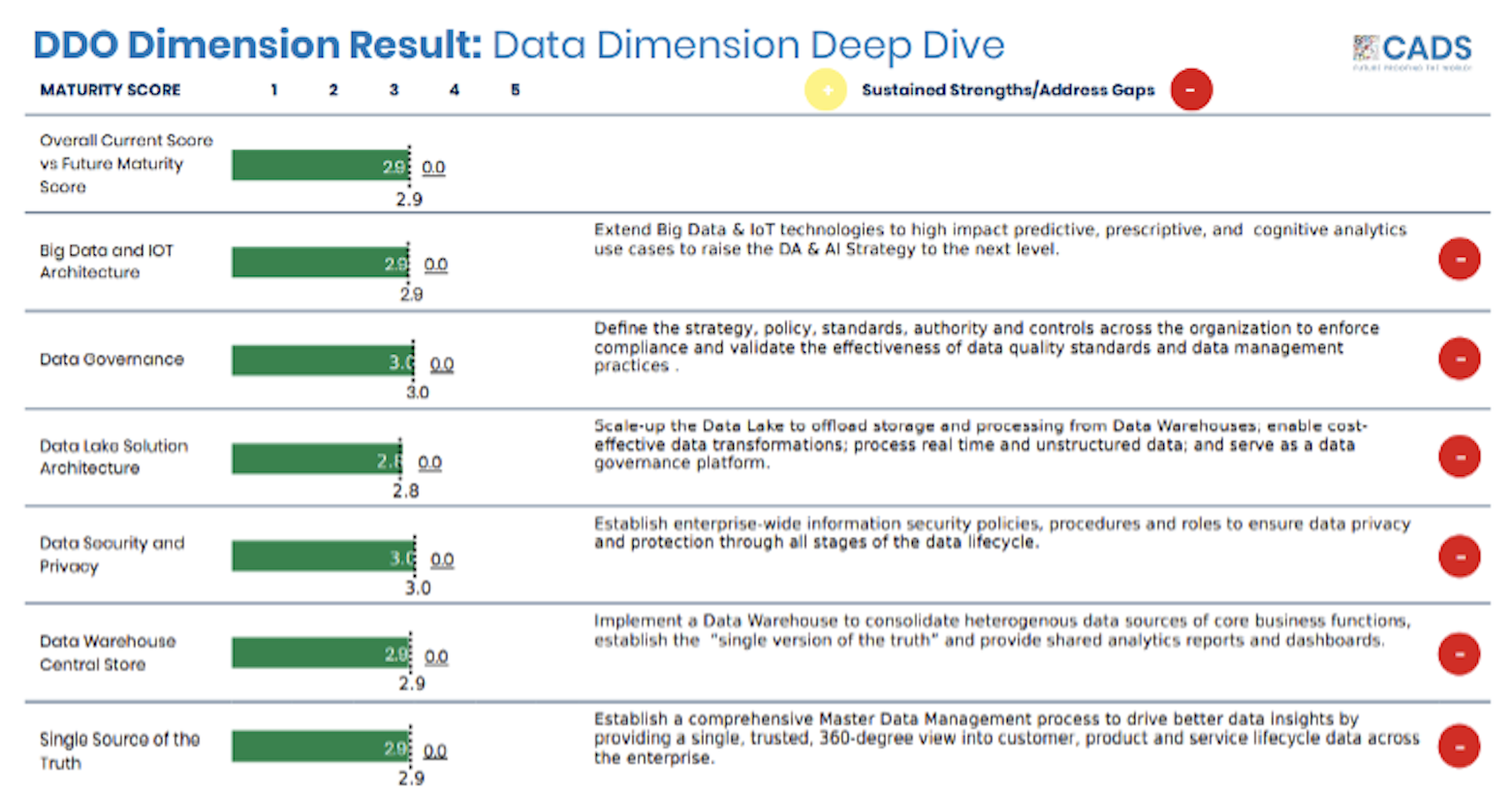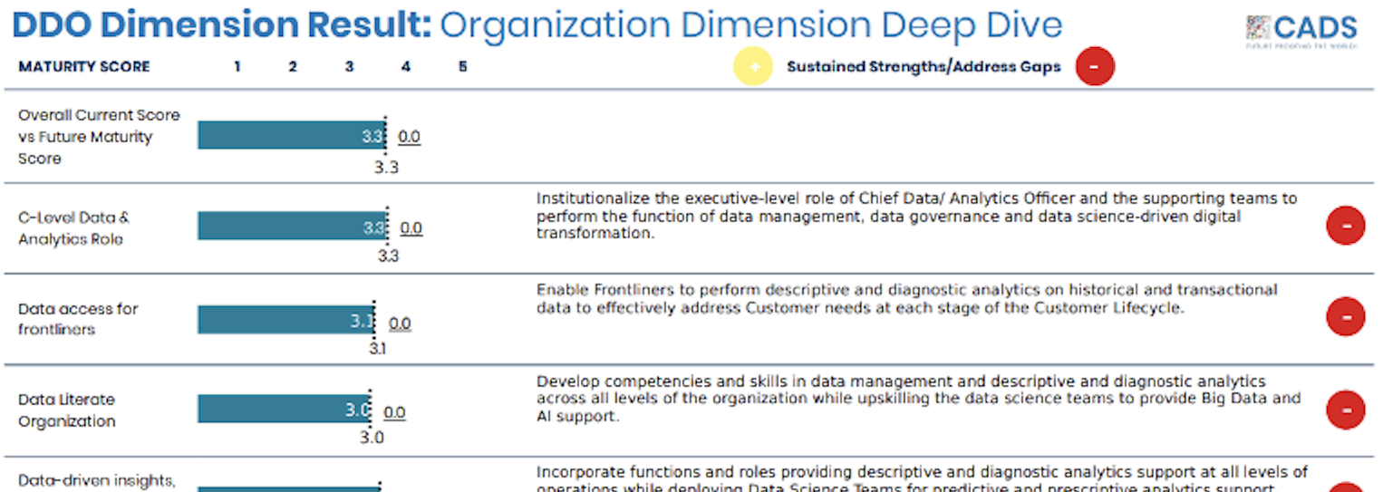The CADS AI DDO Report provides valuable insights & recommendations on how to address gaps these areas and more: advanced decision analytics, data quality, data science sandbox, function-specific data analytics capabilities, real-time data analytics, big data and IoT, data governance, data solution architecture, data security and privacy, data warehousing, C-level data & analytics roles, data access for frontliners, data-literate organization, data-driven insights; decisions, embedded and networked data science teams, experimentation, and fail-fast and recover philosophy and more.