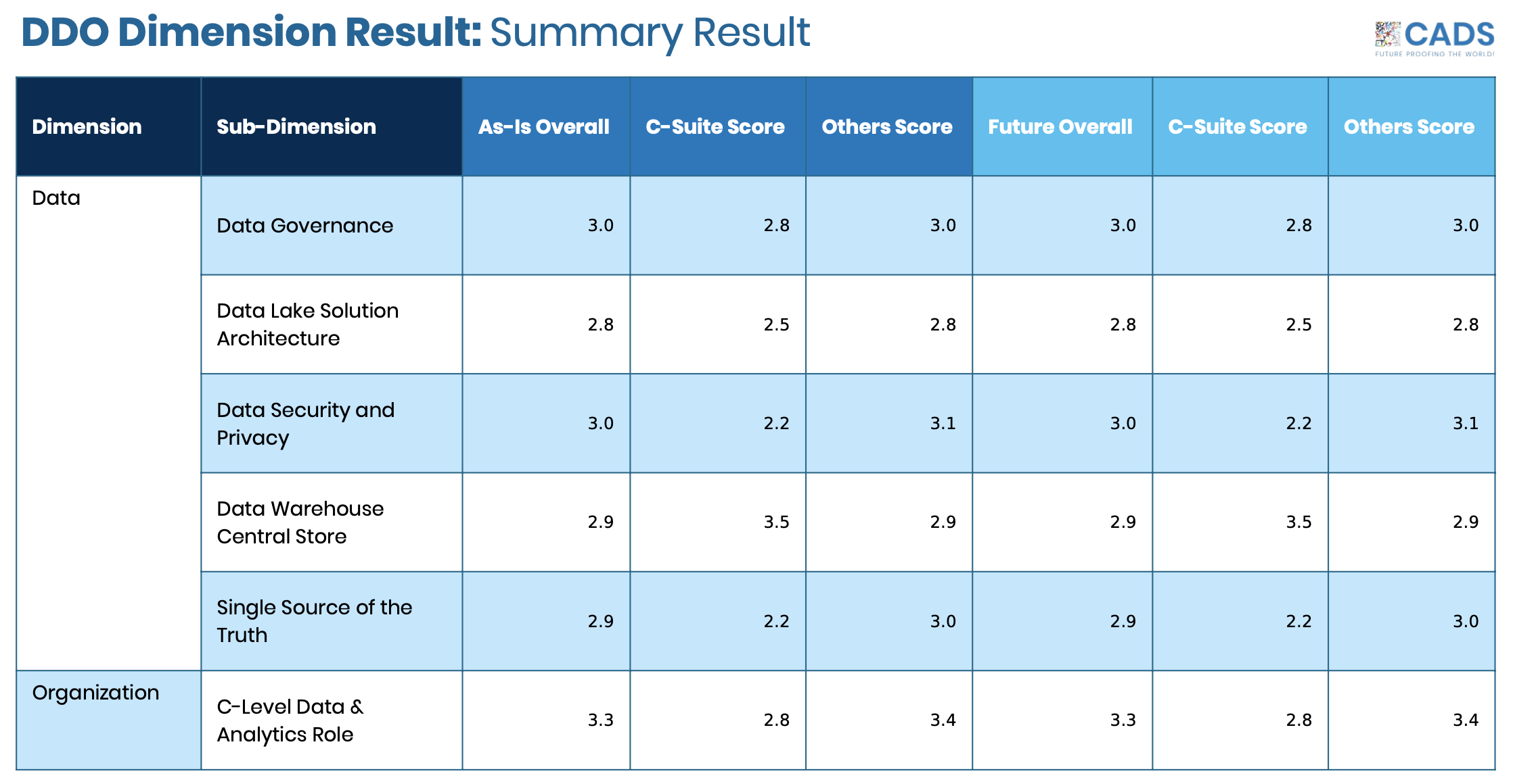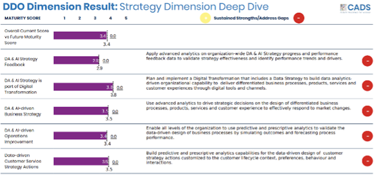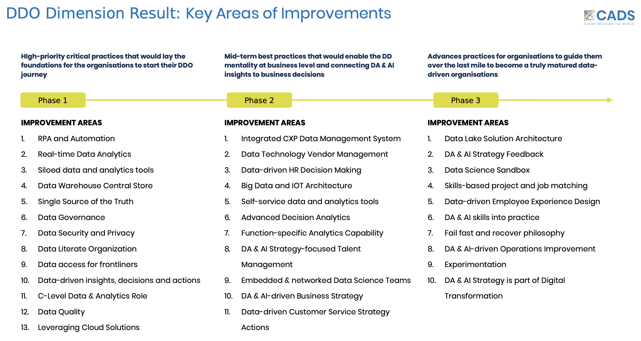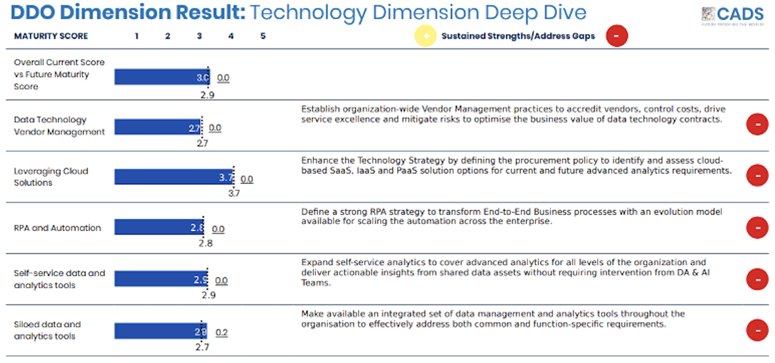 The CADS AI DDO Report provides valuable insights & recommendations on how to address gaps these areas and more: advanced decision analytics, data quality, data science sandbox, function-specific data analytics capabilities, real-time data analytics, big data and IoT, data governance, data solution architecture, data security and privacy, data warehousing, C-level data & analytics roles, data access for frontliners, data-literate organization, data-driven insights; decisions, embedded and networked data science teams, experimentation, and fail-fast and recover philosophy and more.
