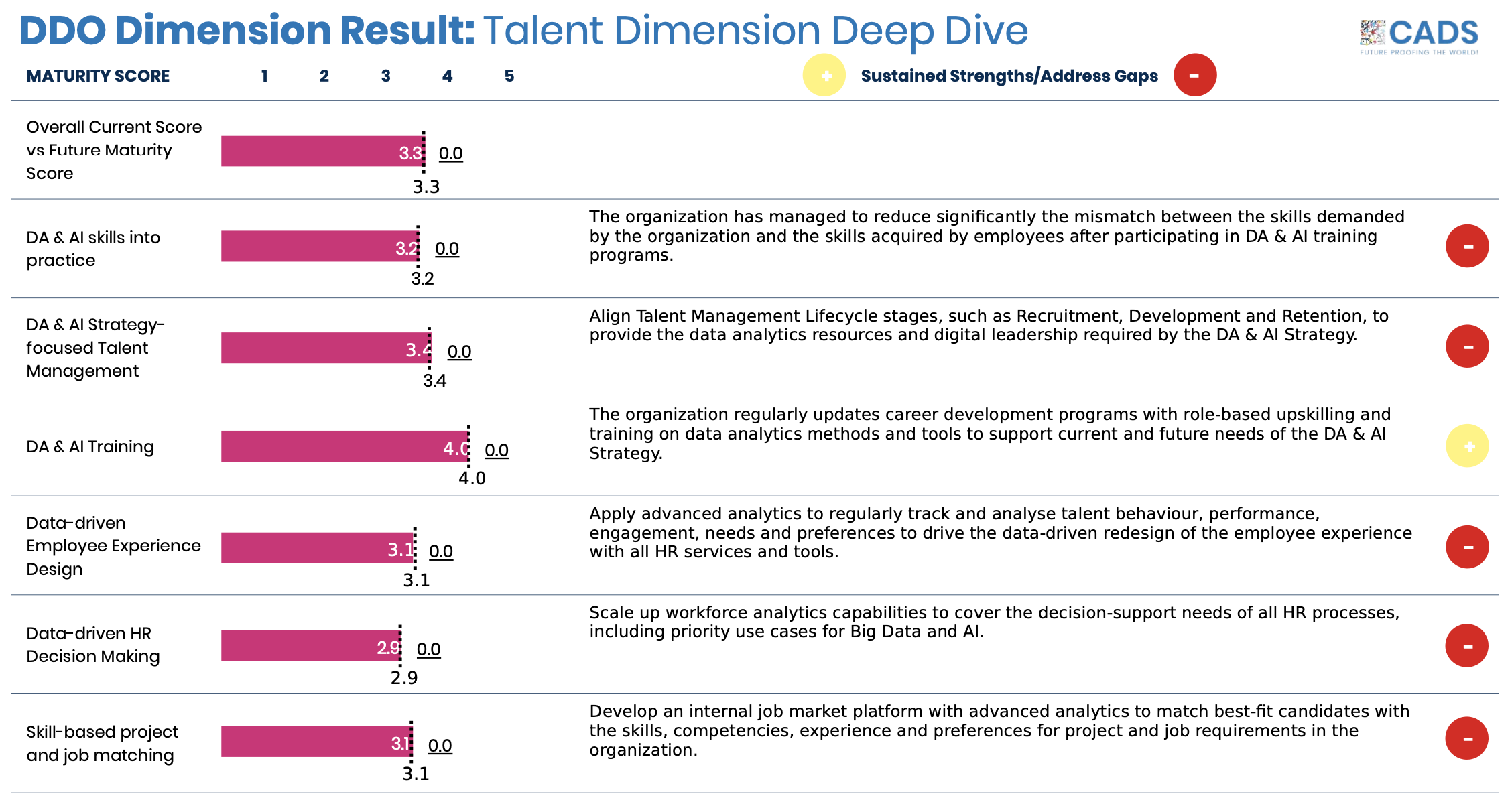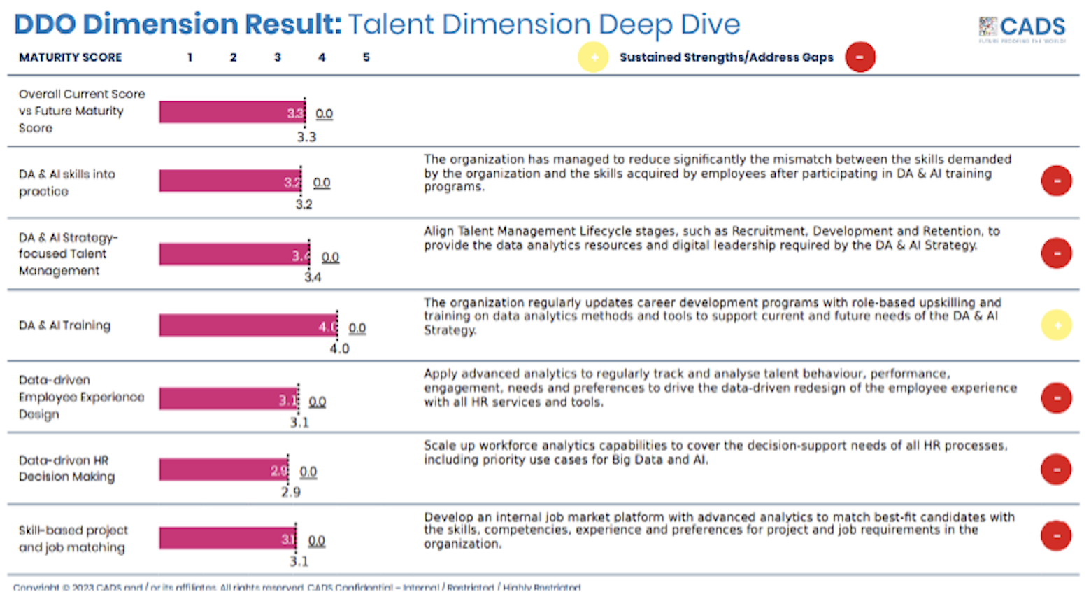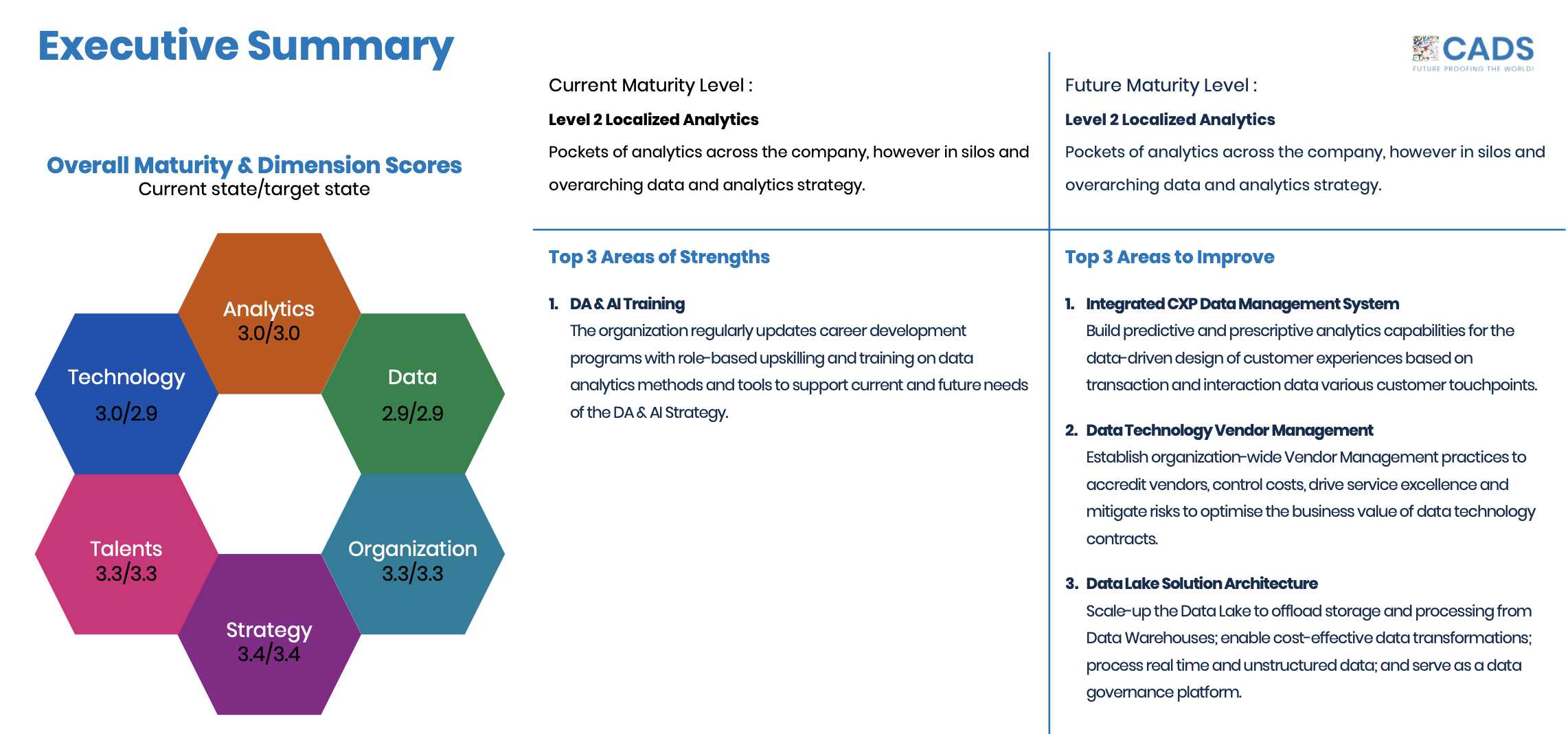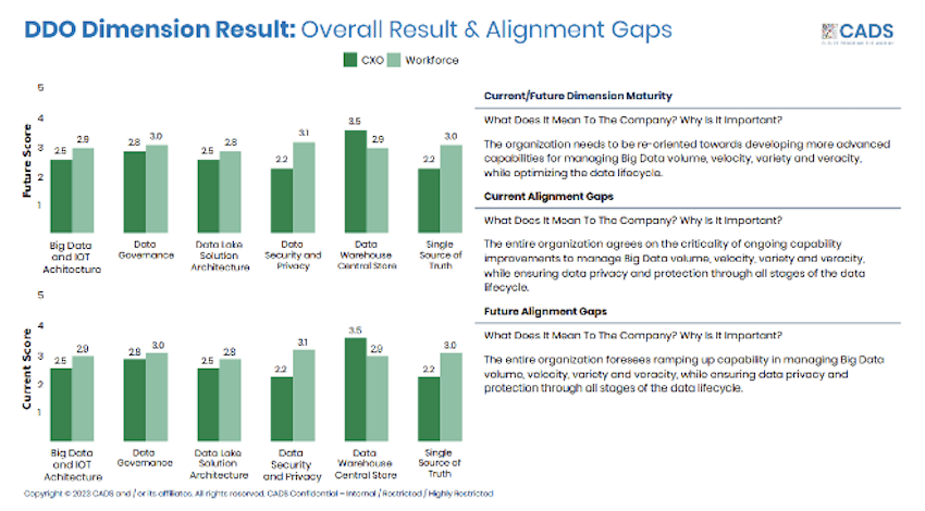 The CADS AI DDO Report provides valuable insights & recommendations on how to address gaps these areas and more: advanced decision analytics, data quality, data science sandbox, function-specific data analytics capabilities, real-time data analytics, big data and IoT, data governance, data solution architecture, data security and privacy, data warehousing, C-level data & analytics roles, data access for frontliners, data-literate organization, data-driven insights; decisions, embedded and networked data science teams, experimentation, and fail-fast and recover philosophy and more.